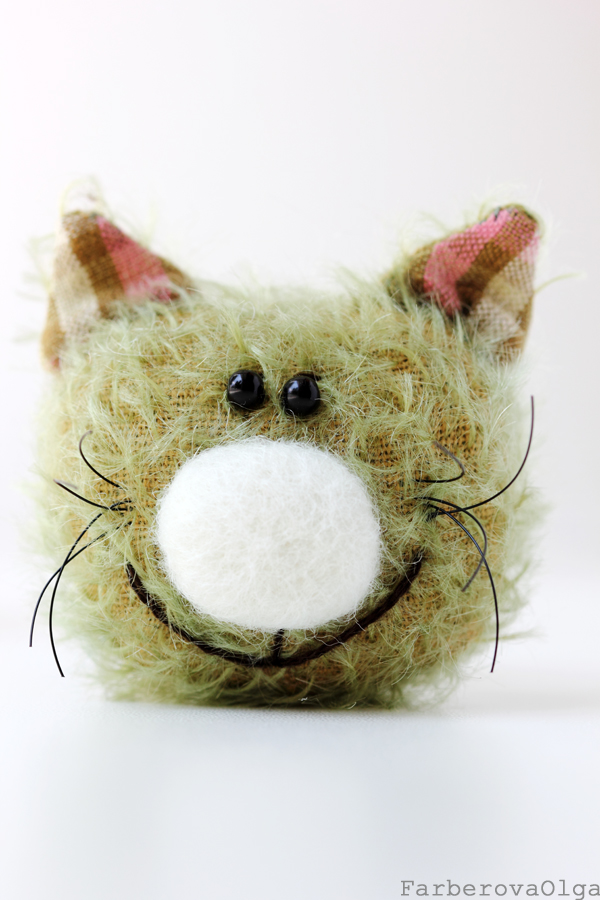 Cat wears mohair scarf with button. Head is on movable fastening of the cotter-pins, paw is on movable fastening of the thread. Her nose is needle felted.